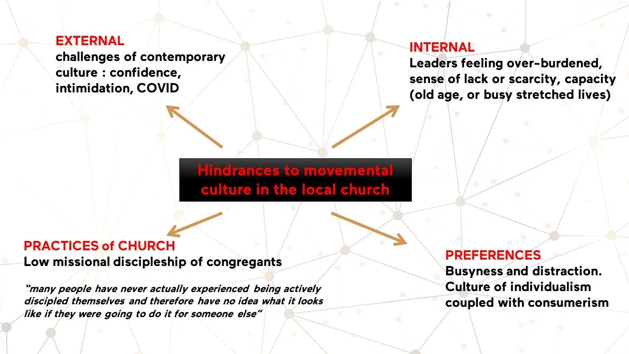 Leaders identified a principal hindrance as Christian’s lives not being structured around missional discipleship, by choice, preference or distraction. Personal hindrances included a feeling of fear or a lack of confidence in sharing the gospel and a lack of significant relationships or social networks with non-Christians. The two most common hindrances were identified as people’s busyness, and a culture of individualism coupled with consumerism.