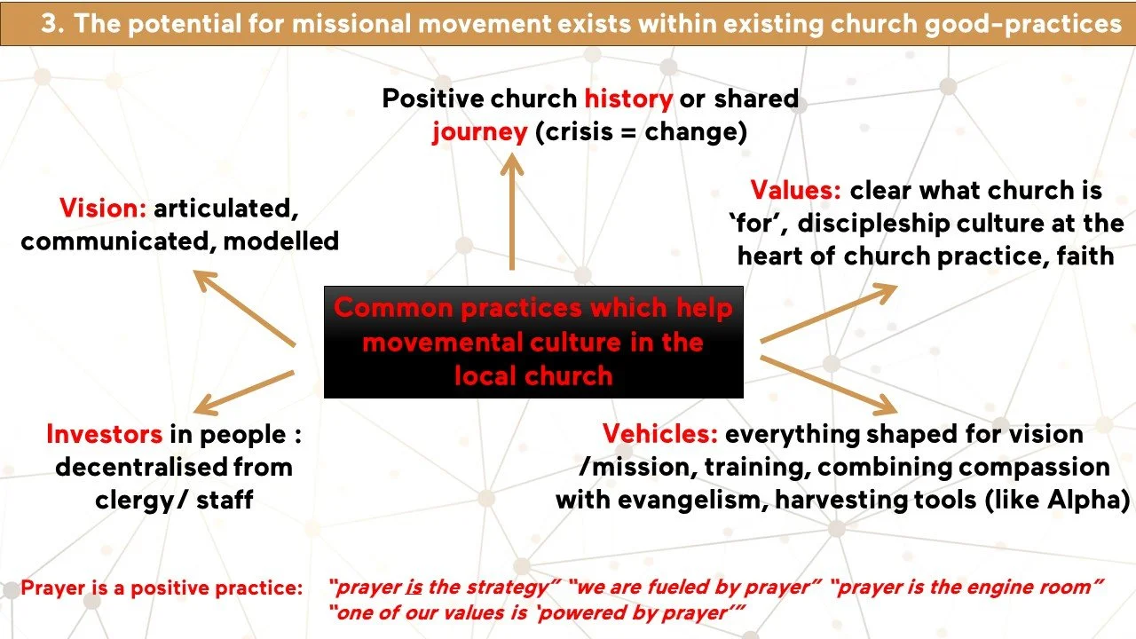 Best practice leaders worked to create a culture which perpetuated their movemental vision and values and was encapsulated in people’s practices. Two key areas which helped transition churches towards a missional movement: