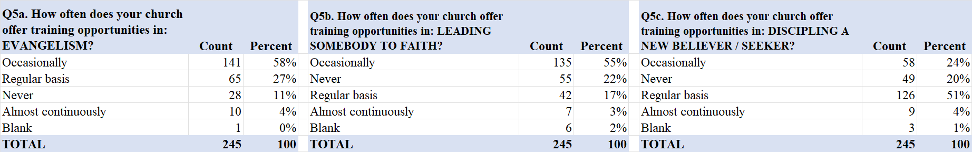 Many leaders in both research instruments identified a long-term cultural issue within British Christianity: that there had been insufficient modelling and training in personal missional discipleship within the average congregation. Findings show that the majority of churches offered a very low frequency of training in this field, for example in staple missional practices such as evangelism, leading others to faith and discipling a new believer.
